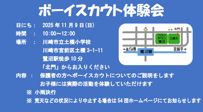 スカウトフェア(ボーイスカウト説明会) 2024.09.252025.09.18 ボーイスカウト説明会を開催します。日にち:2025年11月9日(日) 時間 :10:00~12:00場所 :川崎市立土橋小学校(川崎市宮前区土橋3-1-11)詳しくはチラシをご確認ください。 スカウトフェア2025秋ダウンロード