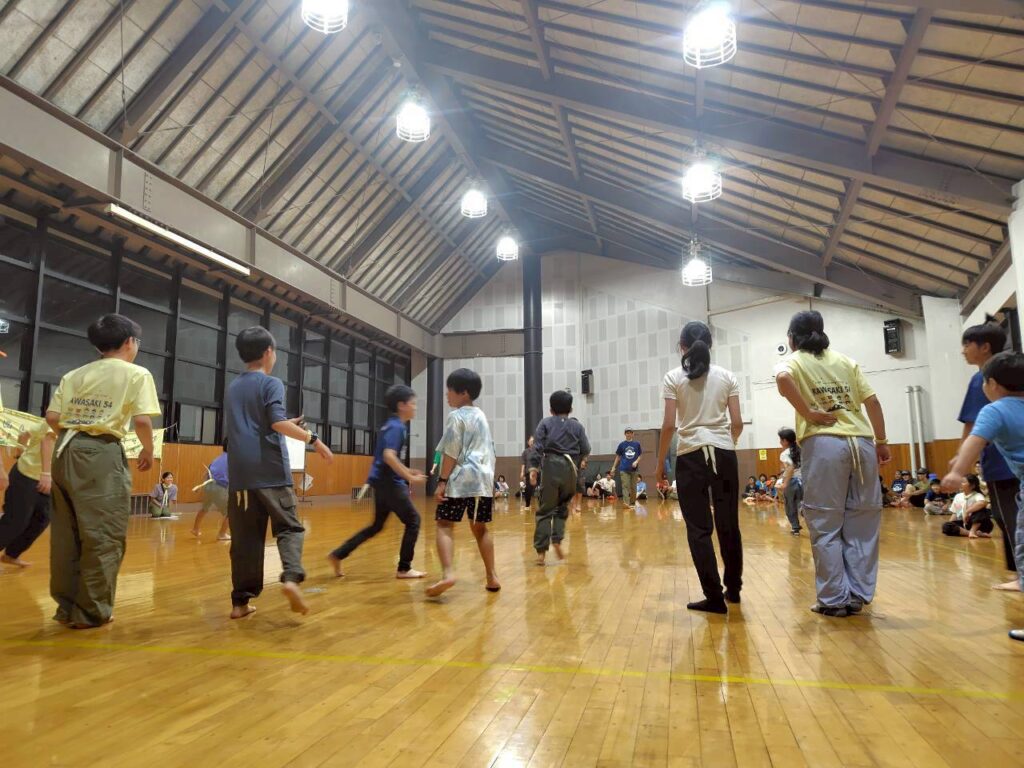 夕食の後は、団のみんなでナイトプログラム「しっぽとり」で遊びました。しっぽに見立てたチーフを取り合うゲームです。