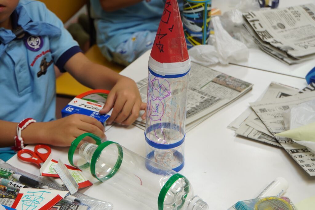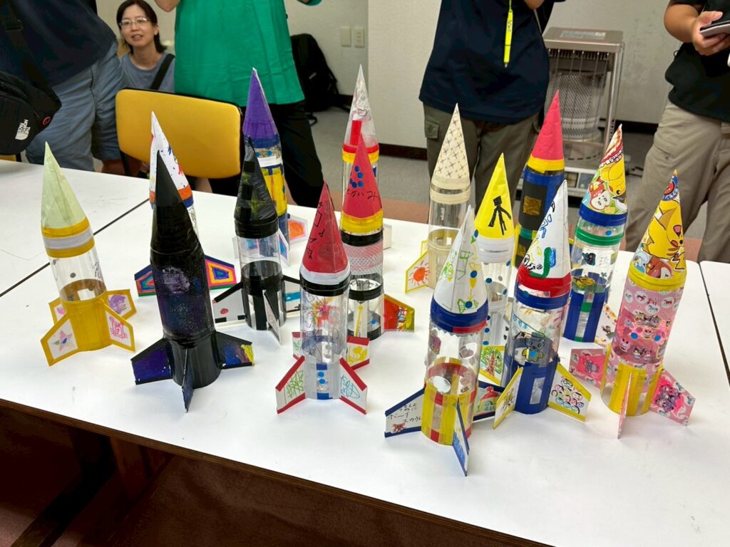 マジックやシール、テープで自由にデザインしてもらいました。みんなの自慢のロケットを並べてみたら、まるで美術館の展示のようでした!