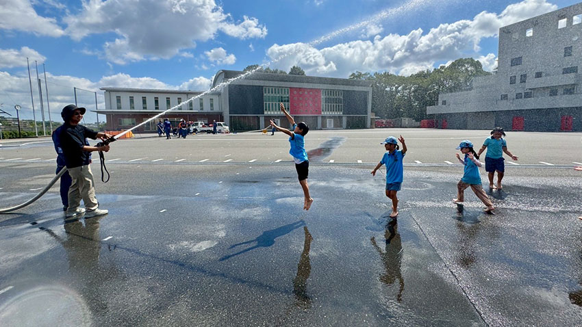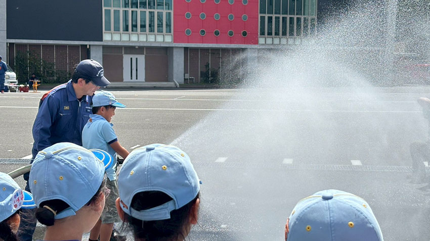 消防訓練センターでは、消防車両の見学、防火服の着用、車両ホースの放水体験をさせていただきました。