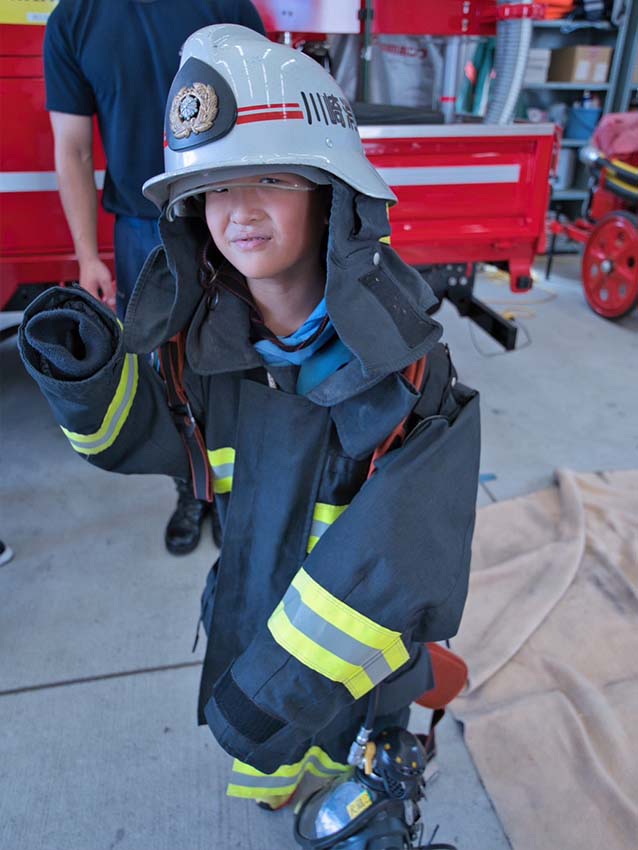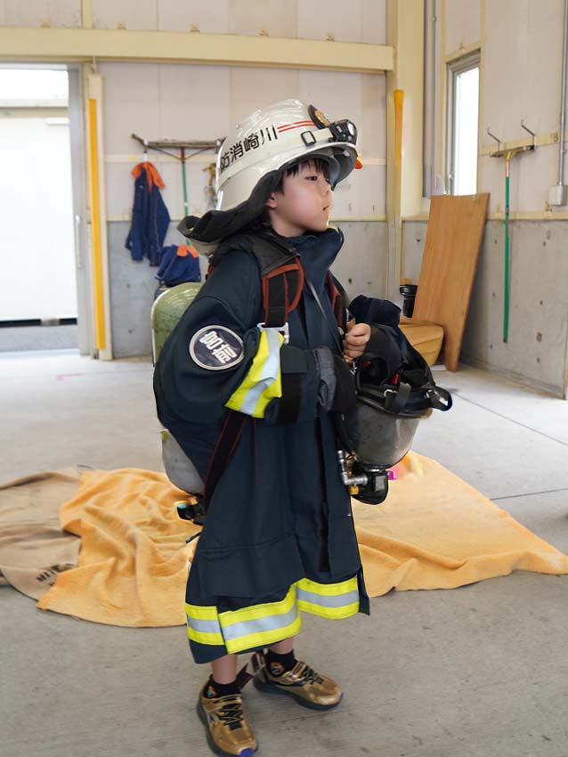 防火服は実際に隊員の方の早着替えを見せてもらいました。出動時さながらの早着替え、見事でした!