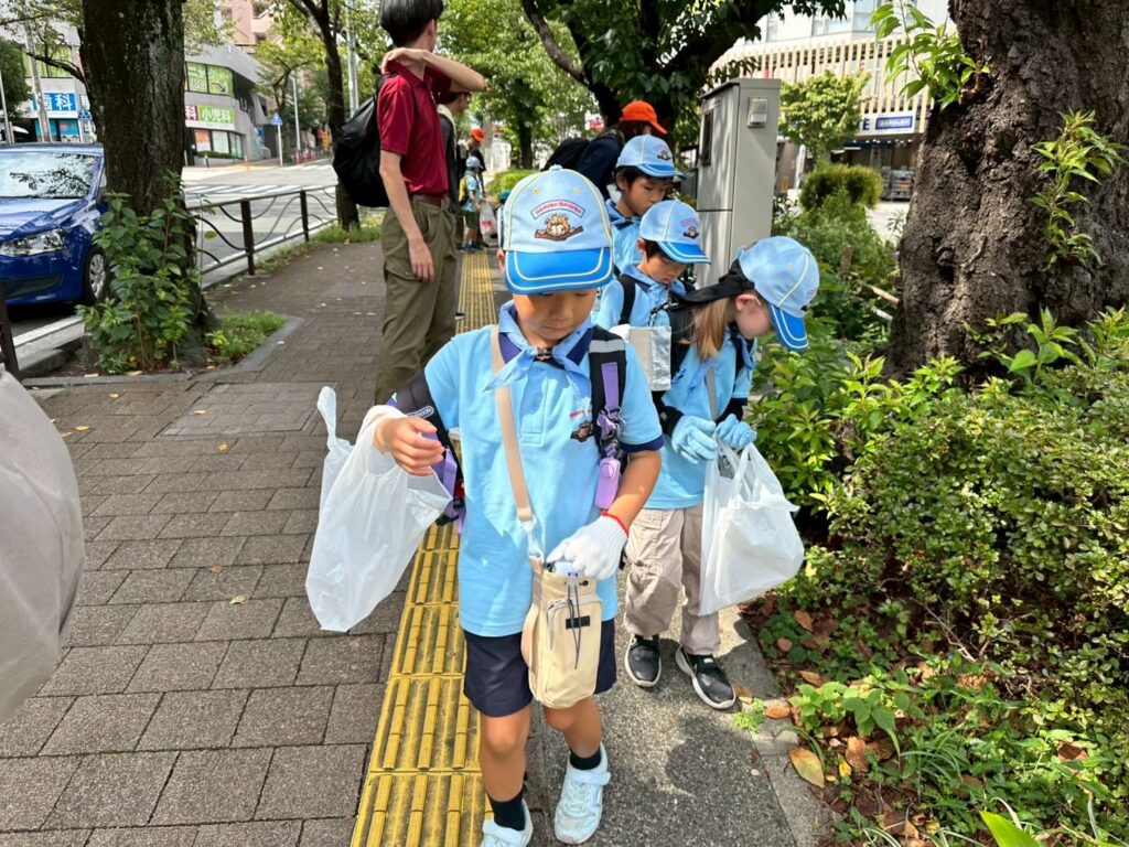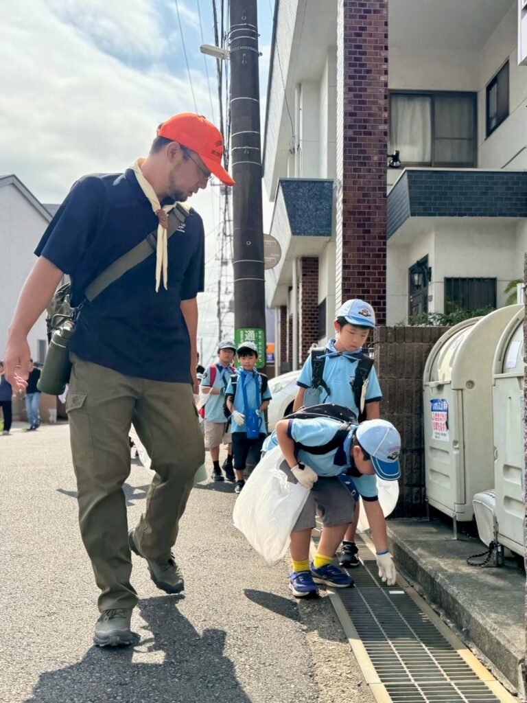 ビーバー隊は宮崎台駅周辺から宮崎おちば公園のごみ拾いを担当しました。まず出発の前に、街とごみに関するお話を聞きました。ごみはどうやって回収されるの?分別とはなに?なぜ分別をする必要があるの?なぜ街をきれいにするの?