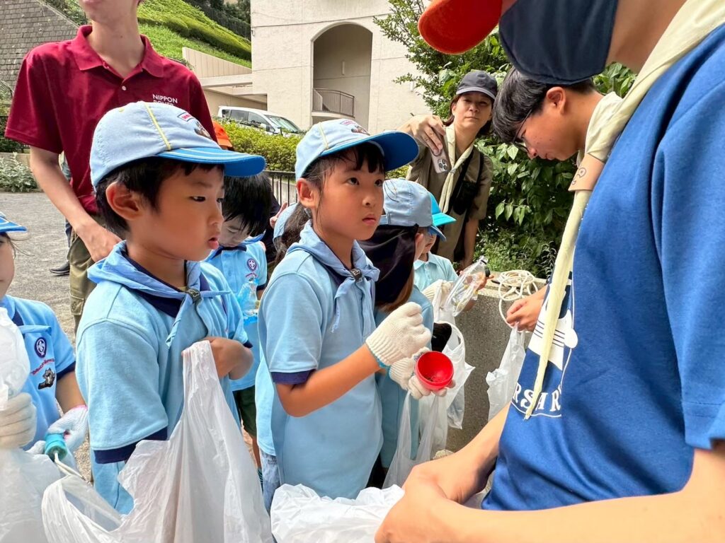 ゴールの公園に到着したら、拾ったごみの分別を行いました。ベンチャーやローバーのお兄さんたちがお手伝いをしてくれて、あっという間に完了!そのあとは、お兄さんたちと「しっぽとり」ゲームで遊びました。