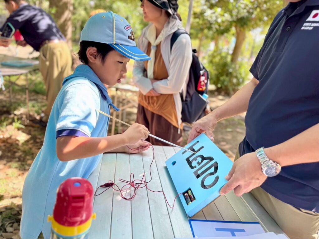 世界のあいさつのことばをなぞっていく迷路、安全な水を走って届けるかけっこ競争、世界のあいさつを短い時間で覚えて伝えるキムスなど。