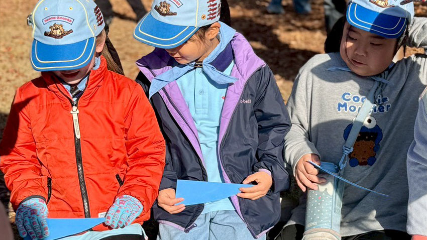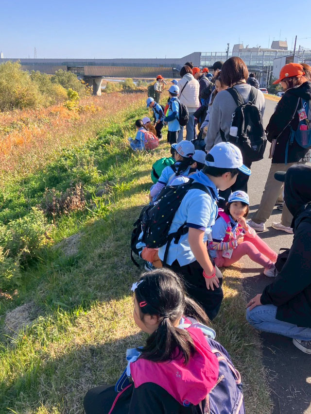 青空の下、スカウトたちは元気いっぱいに歩き始めました。途中、道端に咲く秋の花を見つけたり、ふわふわのススキを発見したり。「これススキだ!」「きれいな花が咲いてる!」と、自然の中での発見を楽しんでいました。