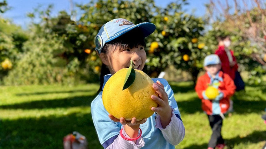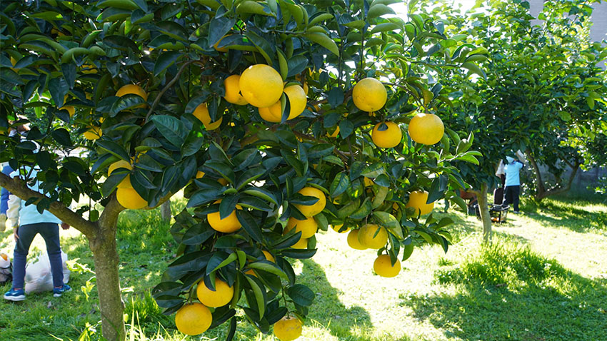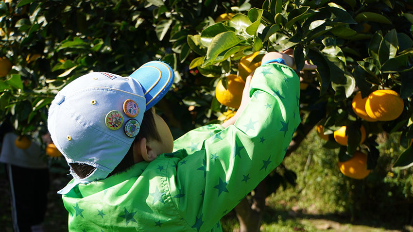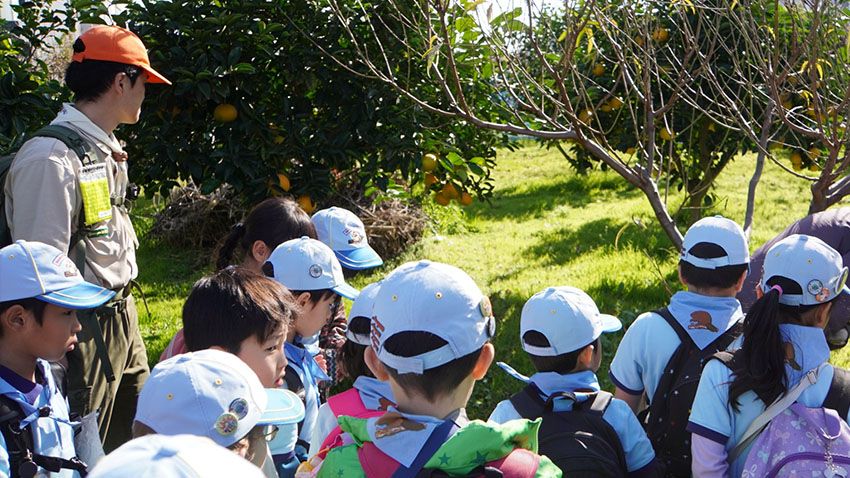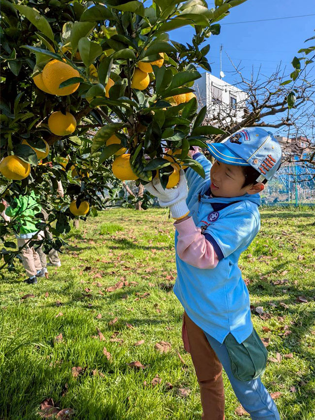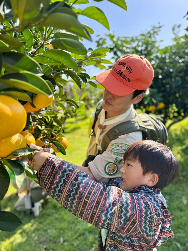 ハイキングの後は、いよいよお楽しみのみかん狩りです!農園に到着すると、たくさんのみかんの木がスカウトたちを迎えてくれました。
